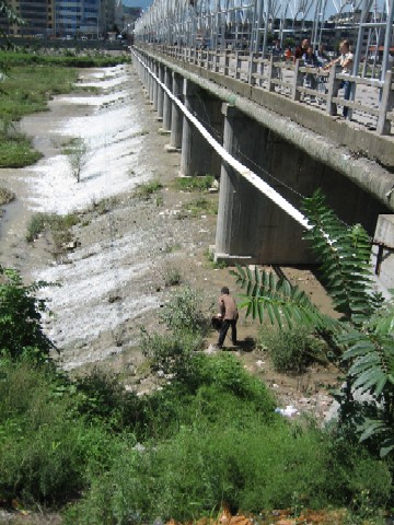 A man collects water from under one of the bridges