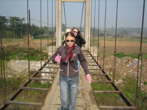 Rachel and our friend and colleague, Michelle, both looking a little nervous to cross the uneven, bouncing hanging bridge