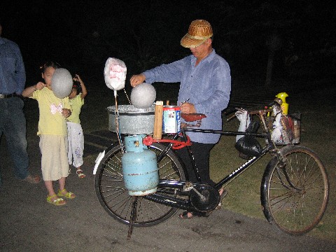This man was making cotton candy in a bicycle-powered machine
