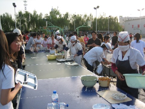 The school reacted quickly, moving the school canteen outdoors. Ping pong tables became serving tables.