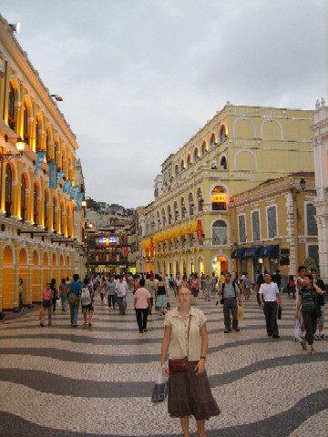 Rachel on a street with interesting, Portuguese-influenced architecture
