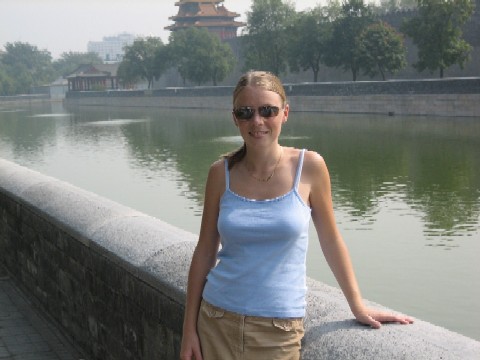 Rachel in front of the moat around the Forbidden City