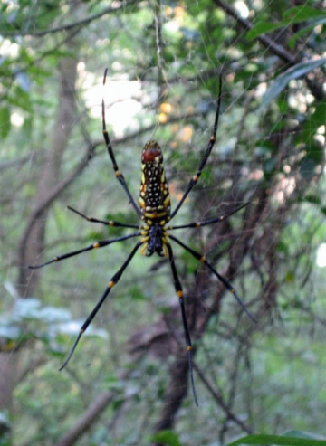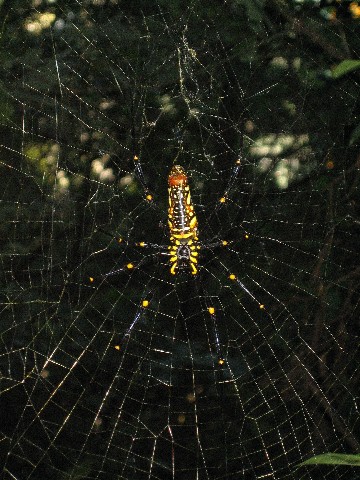 HI! How are you? All is well with us in China. Since we wrote last we have mostly been busy with our TEFL class, and when we are not busy, we go outside and wander around, eat at restaurants, go to shops, etc., and try to get to know Southern China! We are still healthy, although since I wrote last I spent one day going between our bed and the bathroom, but after one day I got better, thankfully. On Saturday Tomas and I went along with our English school to a "nature area." Note that that is what we had expected, but quite quickly we realized that everything in the area was man-made! But it was still fun, and we got to swim (in a perfectly square man-made lake, or a man-made pond). We hiked up a hill, which was quite a climb, actually, in the heat, and we saw a great view. But otherwise, the day was so-so. As a part of the school's really gung-ho "learn English now!" attitude, which the Chinese seem to love, on the 40 minute bus ride we sang "Row, row, row your boat," and "If you're happy and you know it, clap your hands..." and others, the entire way... Yesterday Tomas and I took a very long walk to go to a park which we had seen on the map. We walked, and walked, and walked... and even though it was a beautiful day, of course it was VERY hot outside. But thank goodness for the tree-lined sidewalks on which we walked! Our walk took us completely away from all of the main areas, away from areas that could be international or even touristy in some ways, and brought us into actual small neighborhoods. The buildings seemed run-down, somewhat, but the people that were walking in the neighborhoods were well-dressed. However, I am starting to realize that people really dress nicely (women almost always in cute dresses), but maybe their living areas do not look that nice on the outside at least. Anyway, we saw something interesting: on some balconies people had stuck in huge pieces of chards of glass, to prevent people from climbing over! Other than that, we mostly saw trees, cars, people biking or walking, (and staring at us a lot), and some people sitting along the sidewalk selling their fruits. We bought some small, stubby bananas from a couple on the street. Boy, were they excited when we could buy them in Chinese! (The women show lots of emotion anyway, and I assume the men are happy too). The bananas were not like normal bananas we have either in the U.S. or Sweden...they were almost sweeter and a little tangy, as if someone had put pieces of kiwi inside them (but the color was yellow and reddish). Anyway, after a long hike, at which time I was getting WAY overheated again, we came to a park where we saw some nice views of the city (and kind of shocking spider as well--the biggest I have ever seen, and yet I only very calmly--very unlike me by the way--told Tomas to get out the camera. He hadn't seen it yet). See some pics. Can anyone identify the type of the spider, by the way??? I would love to know if we saw something common, uncommon, or poisonous, or not... Time for some lunch soon. Take care and write back soon! love Rachel and Tomas  | | Huge spider |