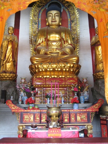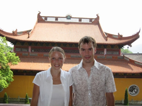 Hi! How are you? I thought I would write briefly about what we did today. This morning Tomas; our Chinese tutor, Robin (his English name), and a nice guy in our class, Kyle, and I went by taxi to a nearby Buddhist temple. The drive was curvy and very steep, but the driver did not seem to be bothered at all since he did not take the road too slowly... On top of a very high hill, the Buddhist temple covered a large area. As soon as we got out of the car, we just loved it. All of the buildings were in the traditional Chinese style (but many were newly built or renovated, so concrete and wood), and as we walked around the area, we soon noticed how quiet and peaceful it was everywhere. Once in a while, friendly, curious monks, dressed in long orange robes, would stick their heads out of the buildings to look at us. (Our tutor said that Westerners are rare there). We went into several buildings, and saw several statues of Buddha. The grounds surrounding the temples were not as well-kempt as parks usually are in China, but they were a little more wild (which I like), and we also saw gardens, calm pools (full of turtles, and Robin said that turtles symbolize long life in China), and tons of pretty butterflies everywhere. We also hiked up a very steep hill to a pagoda. When we were about 2/3 of the way up, I started, as usual, to feel like I could barely breathe anymore, due to the extreme heat, and I wondered if I would even make it. But we all managed to get up and the view up there was breathtaking! After the pagoda hike, we ate a nice, very simple, vegetarian lunch together. I think we spent 5 kronor, or about 75 cents, per person, with several vegetable dishes, a soup, and rice. The vegetables were all grown there in the gardens we had seen. We spoke with one monk (with our tutor's help) who told us that some parts of the temple, and some stone tablets with Chinese calligraphy that we had seen, were one thousand years old! I will attach a few photos. Now we are going to go and make Chinese dumplings, which are delicious. They are made from a regular flour dough, with a mixture of vegetables inside, or a meat mixture, and then they are closed in a half-moon shape. These are then boiled, steamed, or fried, and they are eaten with a soy-vinegar sauce and some spicy flavoring. Delicious! This is what Tomas always wants to go out and eat nowadays. Tomorrow morning we have church in the Chinese church again. Hope all is well. Hope to hear from you soon! love Rachel and Tomas  | | Buddha |